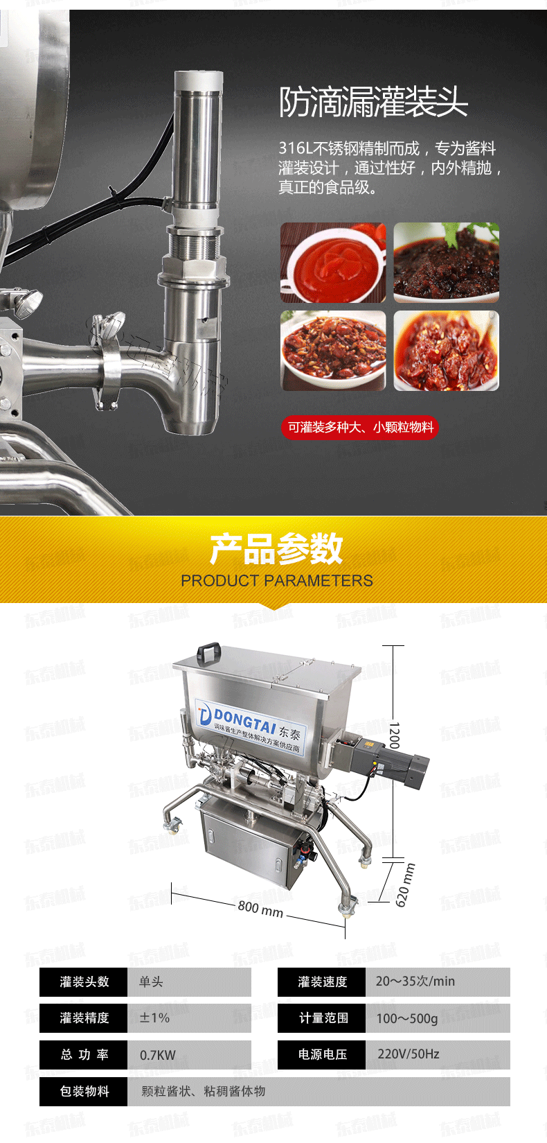 4、顆粒醬定量灌裝機(jī)主要針對食品行業(yè)的醬類分裝設(shè)計生產(chǎn),香菇醬灌裝機(jī)特別適用于調(diào)味品中帶顆粒并且濃度較大的辣椒醬、豆瓣醬、花生醬、芝麻醬、果醬、牛油火鍋底料、紅油火鍋底料等物質(zhì)的粘稠醬類的灌裝;