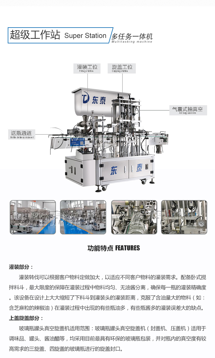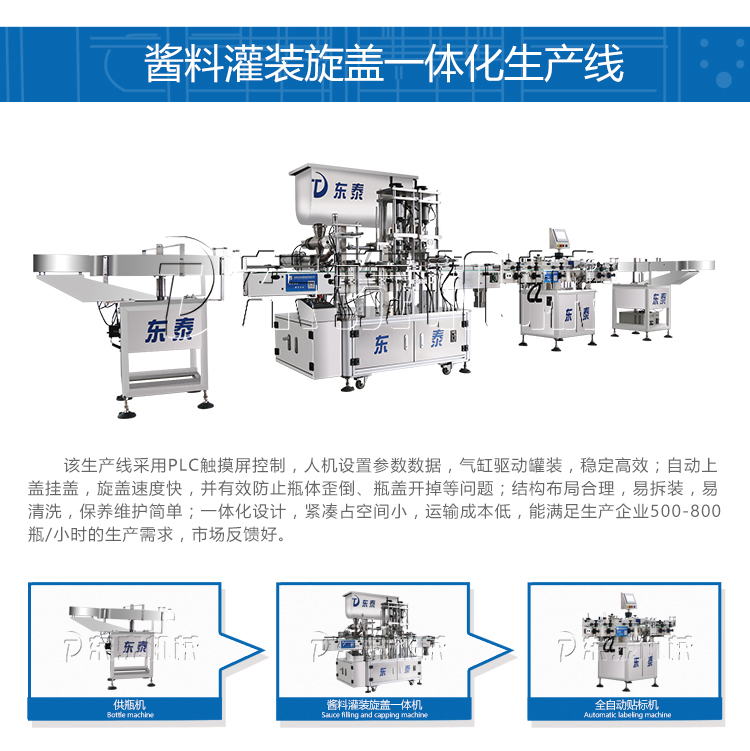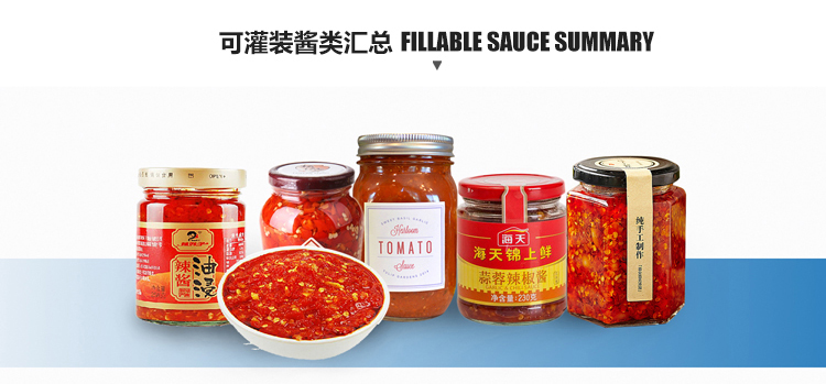 醬類灌裝旋蓋一體機(jī)采用活塞式伺服驅(qū)動原理,適用于調(diào)味品中的醬料,濃湯或者帶顆粒并且濃度較大的辣椒醬、豆瓣醬、花生醬、芝麻醬、果醬、濃醬、蜂蜜等較為粘稠醬類的灌裝,自動化程度高,機(jī)器能完成自動灌裝、自動取蓋上蓋,自動真空封蓋封口。